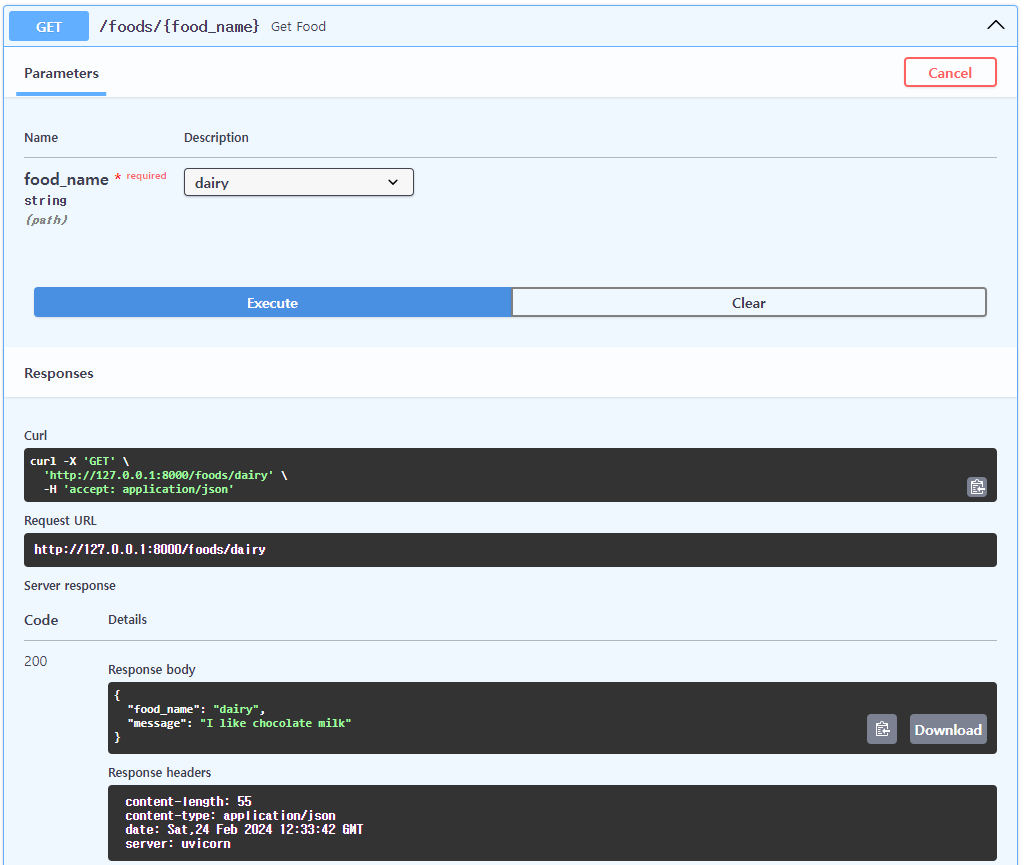 - 위의 두 경우에 해당하지 않는 경우, 즉 food_name이 FoodEnum.vegetables도 아니고 "fruits"도 아닌 경우, "I like chocolate milk"라는 메시지를 반환. 이는 예를 들어 /foods/dairy로 요청한 경우에 해당.