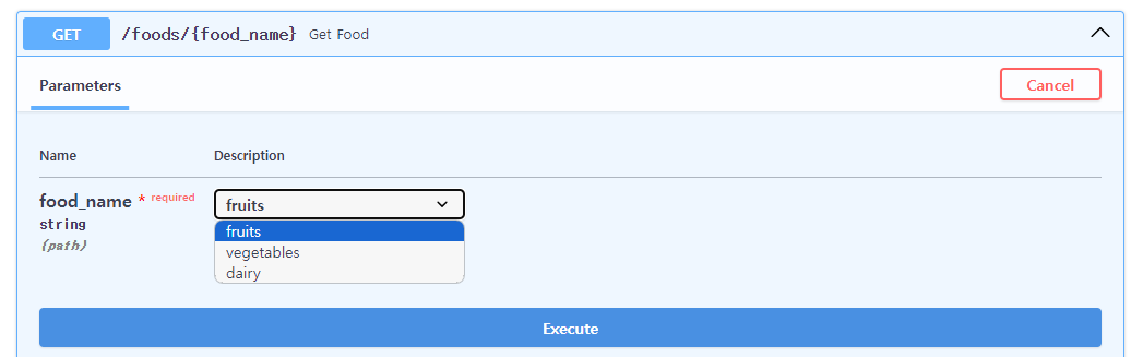 {}에 있는 것을 path parameters라고하며, 인자에서 필수로 넣어야하는 인자(required)임을 확인할 수 있다.